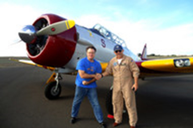 Pilot Bruce Mayes and author Jim Clash before their Pearl Harbor flight aboard the vintage SNJ-5.