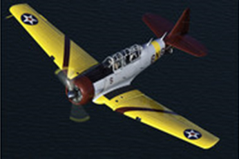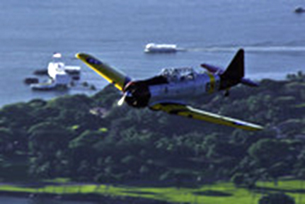 The SNJ-5 over Pearl Harbor. The famous white USS Arizona Memorial can be seen just ahead of its right wing.