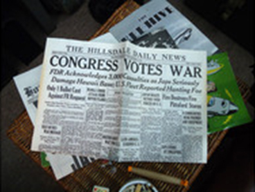 A Michigan newspaper dated December 8, 1941 headlines the Japanese attack on Pearl Harbor.